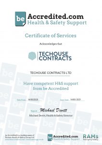 Techouse Contracts Ltd, is committed to the health and safety of our workplace and workforce, therefore, we have a full support from a competent H&S specialist advisors from the Be Accredited Group with qualifications such as NEBOSH General Certificate, IOSH Managing Safely In Construction